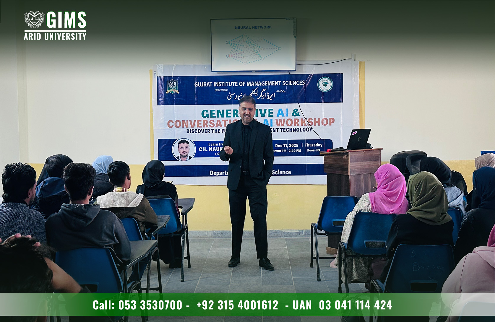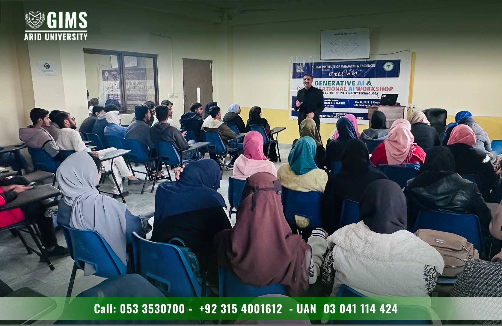 Gujrat Institute of Management Sciences (GIMS) successfully conducted a hands-on workshop on “Generative AI & Conversational AI,” aimed at equipping students with knowledge of cutting-edge technologies shaping the future of digital innovation. The workshop provided valuable insights into the fundamentals of Generative AI, chatbots, and intelligent conversational systems. Participants explored real-world applications, learned how AI models generate content, and understood how conversational interfaces are transforming industries such as customer service, healthcare, and education.